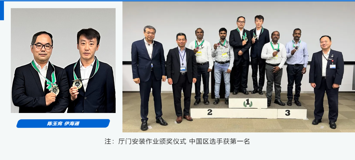 在本屆TTM大會中,東芝電梯中國區的選手們表現出色,參與了控制裝置的組裝、廳門安裝作業及電梯定期檢查三個項目,斬獲了2金1銀的優異成績,展現了領先的技術實力、嚴謹的工匠精神和卓越的團隊協作能力。
