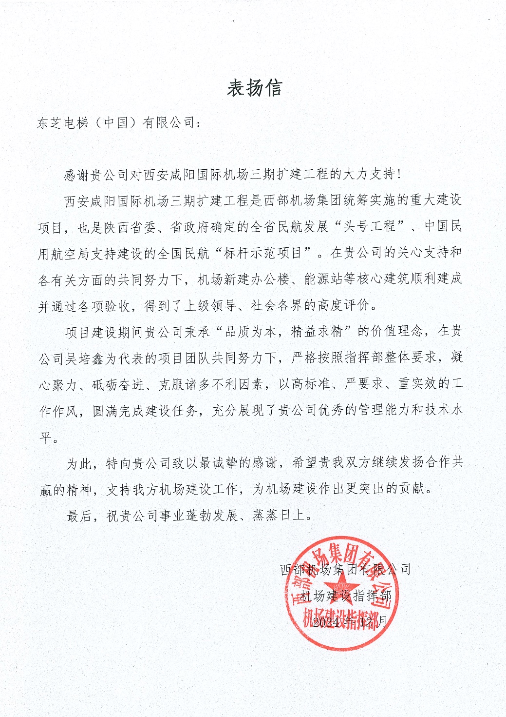 從設備生產到現場安裝,東芝電梯嚴格執行項目部制定的各項規范和時間節點。項目團隊駐扎現場,確保按期保質完工,贏得了客戶對施工質量和契約精神的贊許,被授予“優秀施工單位”稱號。