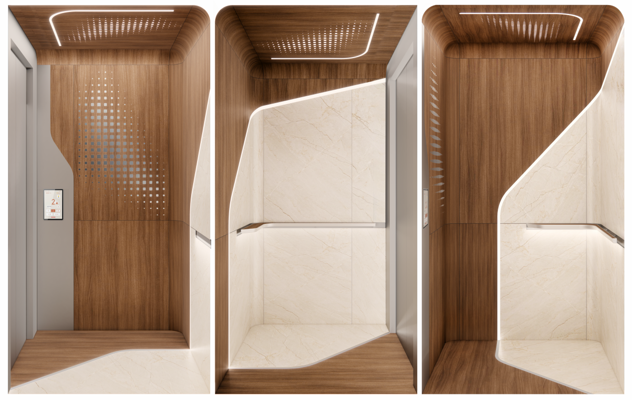 “奢雅流韻”的設計靈感,源自航海工業美學與豪華超跑的動感線條:轎廂造型融入豪華游艇的標志性曲線,水平流動線條與漸變弧度交織,在立體空間中延伸出視覺縱深感;就連轎廂玻璃的弧度,也借鑒了游艇擋風玻璃的優雅形態,自帶靈動氣韻。